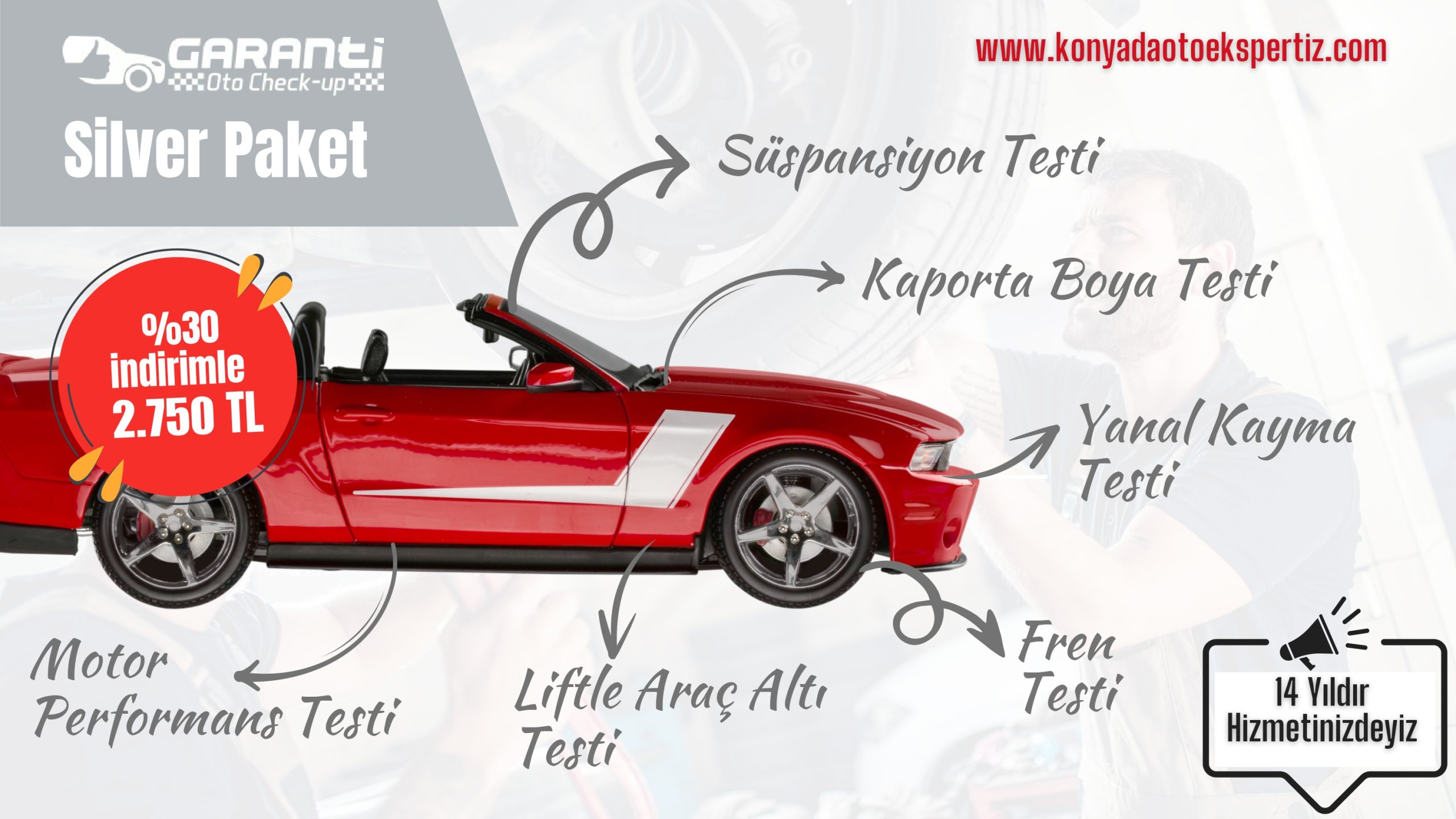 Silver Paket: Süspansiyon testi, kaporta boya testi, yanal kayma testi, fren testi, lifte araç altı testi ve motor performans testi %30,