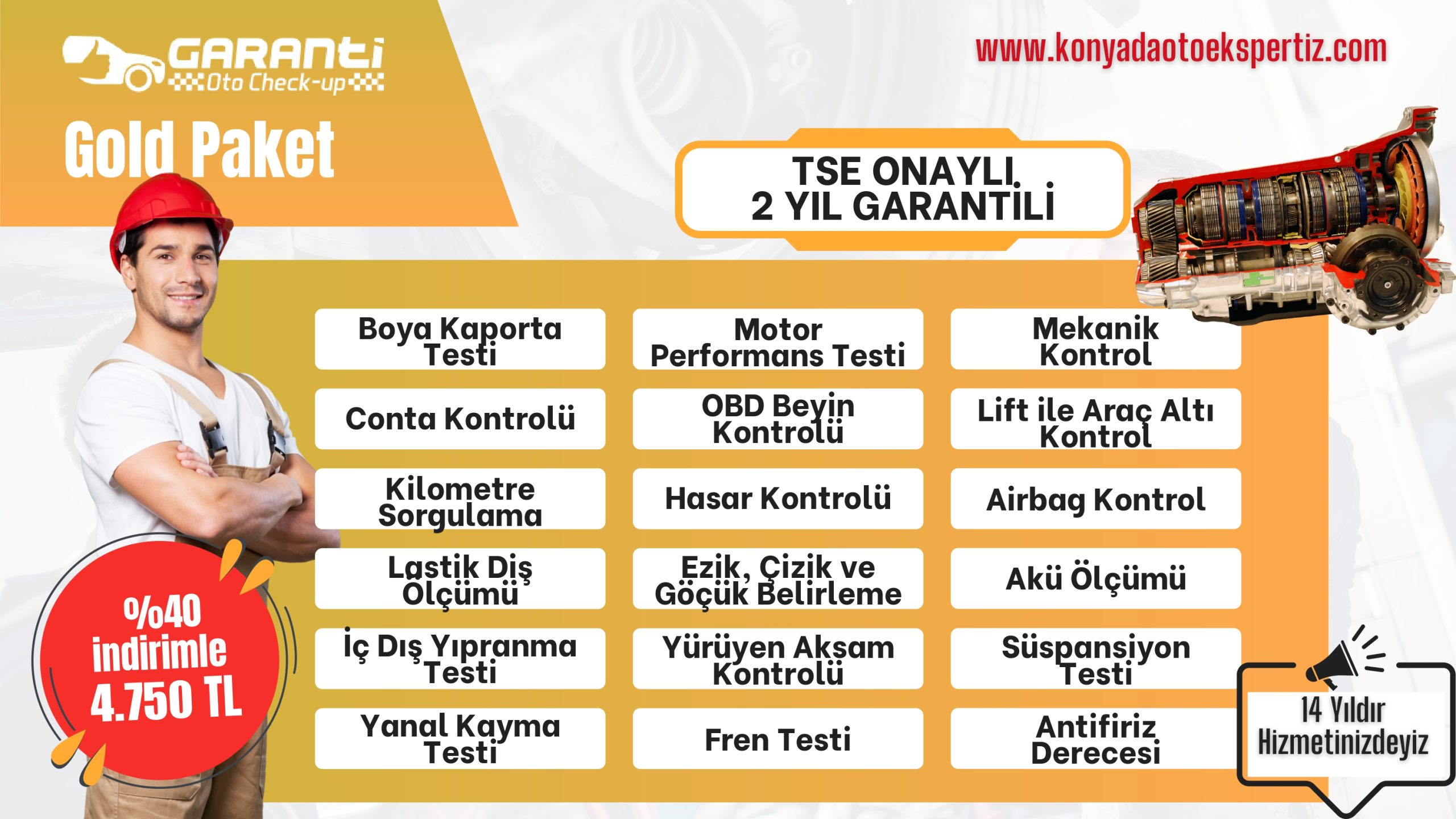 Gold Paket: Boya kaporta testi, motor performans testi, mekanik kontrol, conta kontrolü, OBD beyin kontrolü, lift ile araç altı kontrol, kilometre sorgulama, hasar kontrolü, airbag kontrol, lastik dış ölçümü, ezik, Çizik ve göçük belirleme, akü ölçümü, iç dış yıpranma testi, yürüyen aksam kontrolü, süspansiyon testi, yanal kayma testi, fren testi, antifriz derecesi %40 özel indirim uygulanacaktır.